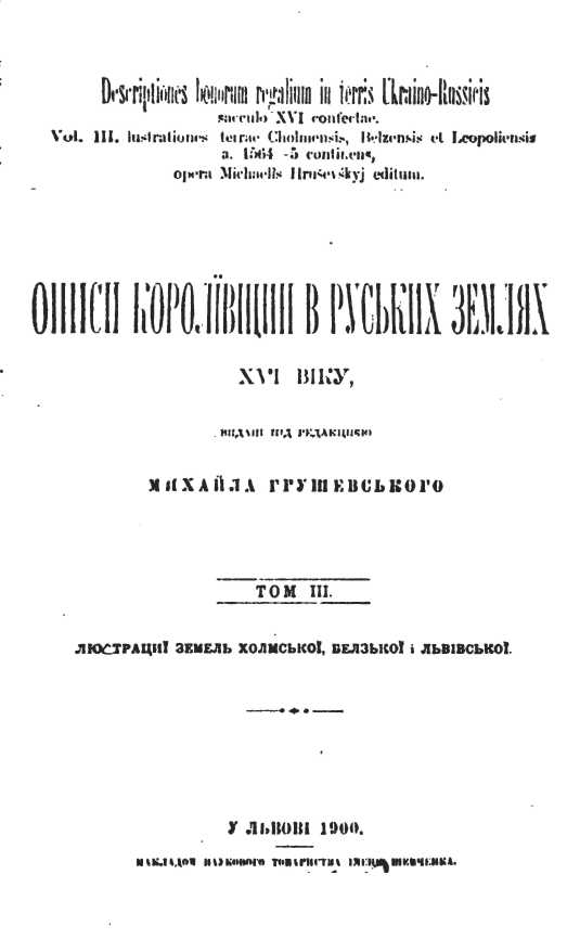 Cover sheet collection of documents "Descriptions of king's lands in 16 cent. Vol. 3. Lustration of Kholm, Belz and Lviv lands", compiled by M. S. Hrushevsky (The sources to the history of Ukraine-Rus, 1900, v. 3).