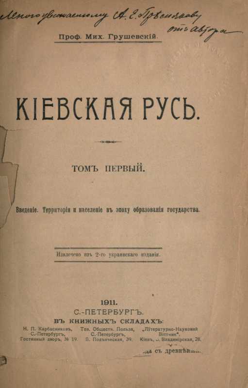 Title page of M. S. Hrushevsky's monograph "Kyivan Rus" (1911). A copy of the M. S. Hrushevsky's inscription for A. E. Presnjakov. |