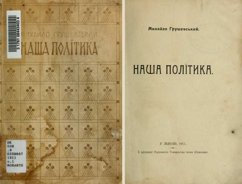 "Our policy" (1911) Cover and title page of M. S. Hrushevsky's collection of articles "Our policy" (1911).