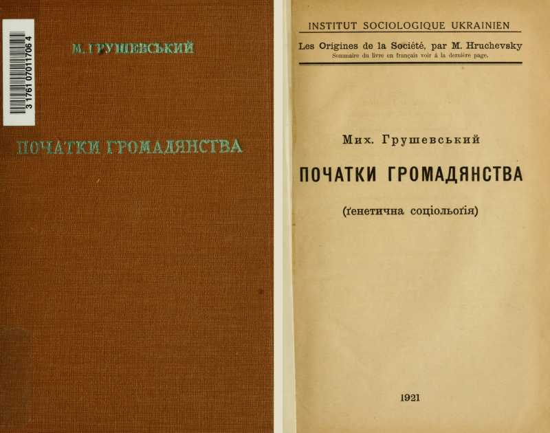 Cover and title page of M. S. Hrushevsky's book "The beginnings of society" (1921). |