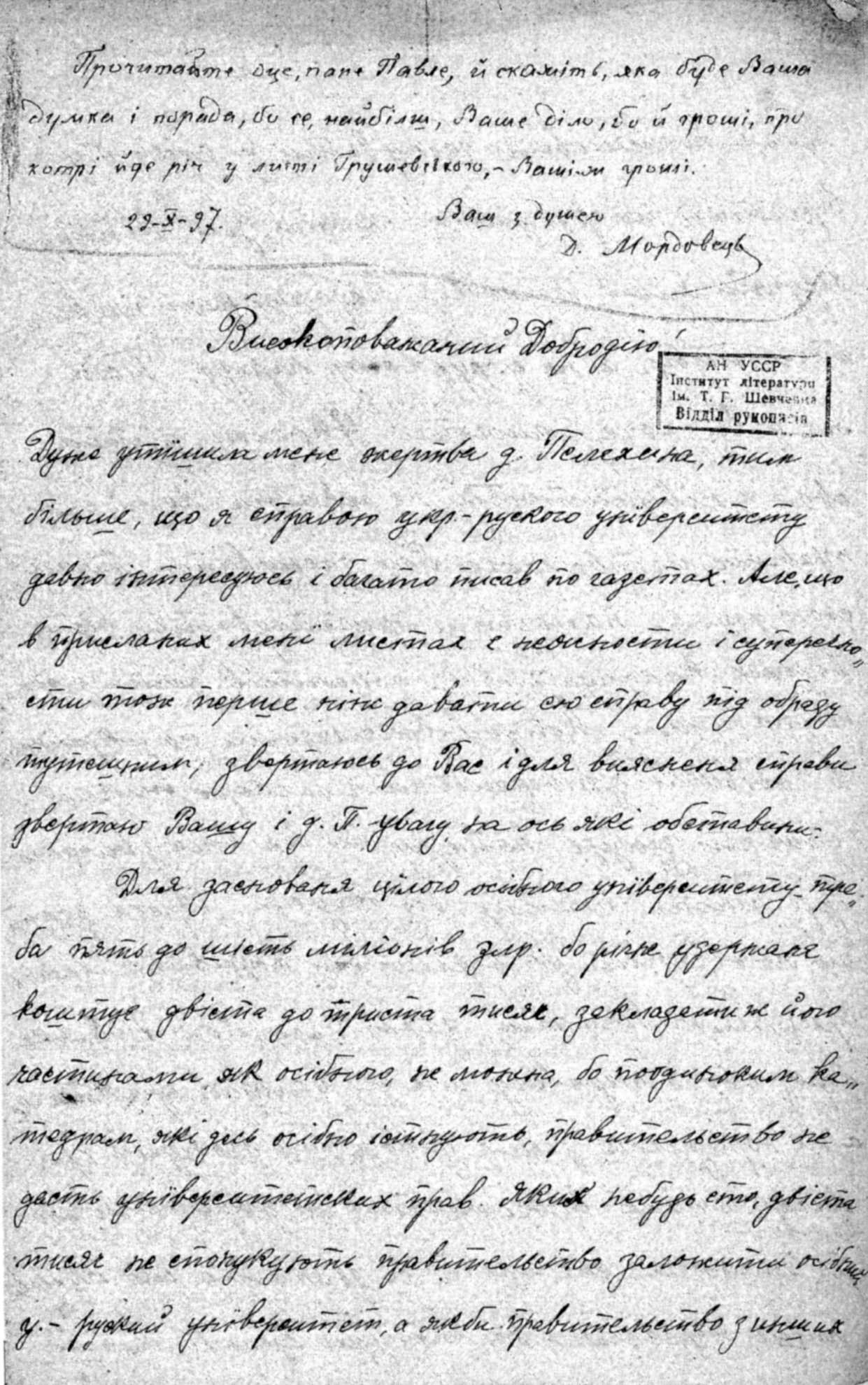 First page of M. S. Hrushevsky's letter to C. Bilylovsky (November 1897; autograph by Mary Hrushevska, postscript by Daniel Mordovets, IL, f.72, № 26)