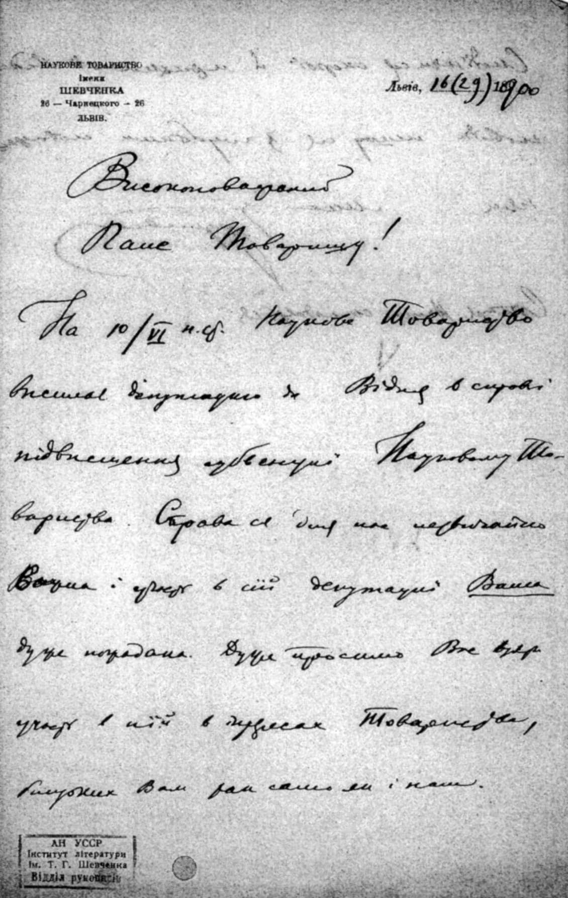 After publication: Correspondence of Mykhajlo Hrushevsky. – Kyiv: 1997, vol. 1, p. 139.