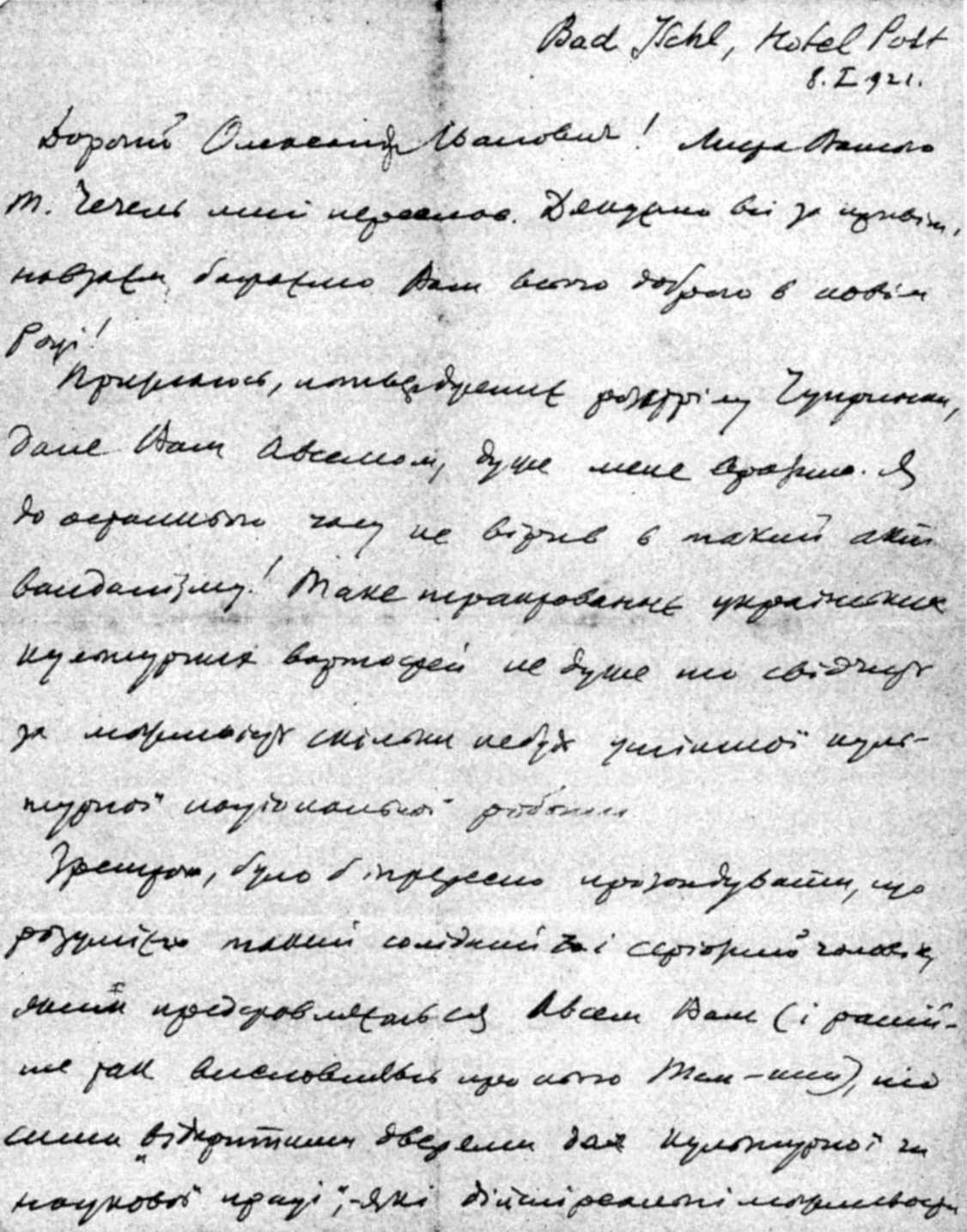 First page of autograph of M. S. Hrushevsky's letter to O. Oles (January 8, 1921, IL, f.114, № 16/2)