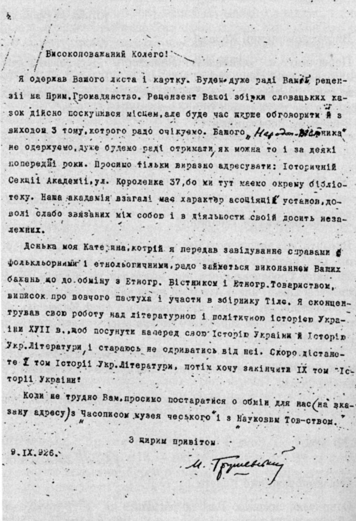 Letter to J. Polivka (1926)Photocopy of the authorized typing of M. S. Hrushevsky's letter to J. Polivka (September 9, 1926, IL, f.122, № 30, ark.12) After publication: Correspondence of Mykhajlo Hrushevsky. – Kyiv: 1997, vol. 1, p. 282. |