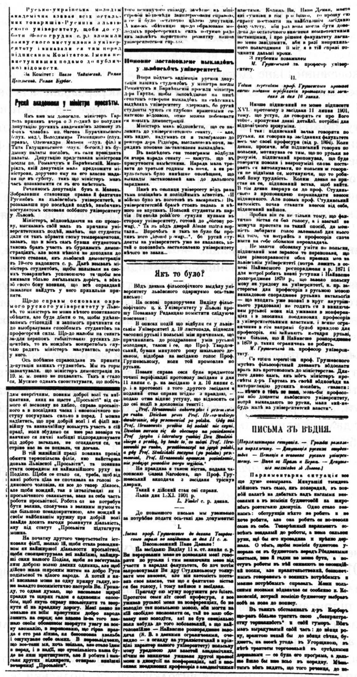"How it was" (1901)Page of "Delo" newspaper, where M. S. Hrushevsky's article "How it was" was published (1901) After publication: Hrushevsky M.S. Works in 50 volumes. – Lviv: Svit, 2002, vol. 1, p. 218. |