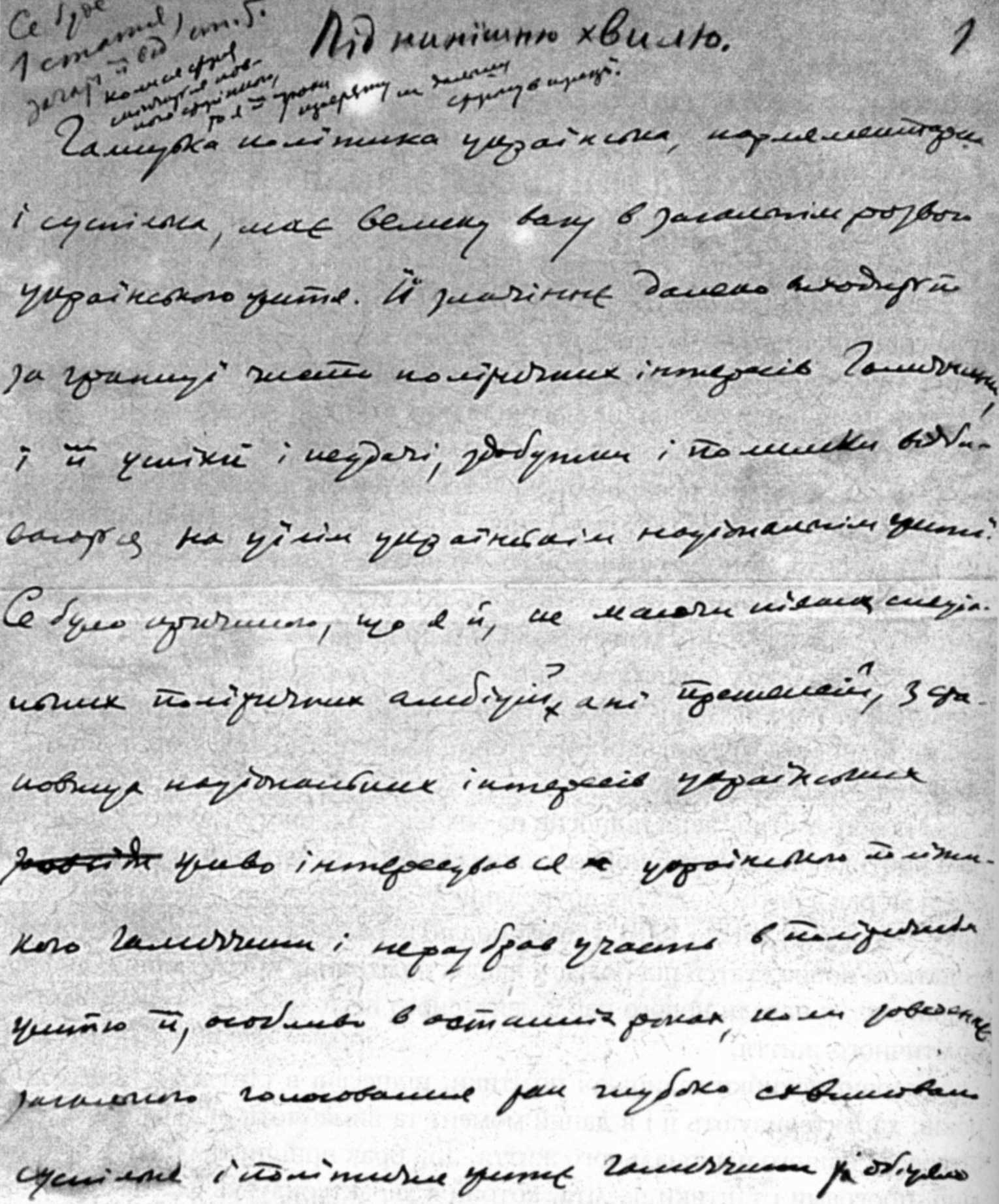 "Under the current moment" (1911)First page of autograph of M. S. Hrushevsky's article "Under the current moment" (1911) After publication: Hrushevsky M.S. Works in 50 volumes. – Lviv: Svit, 2005, vol. 2, p. 254. |