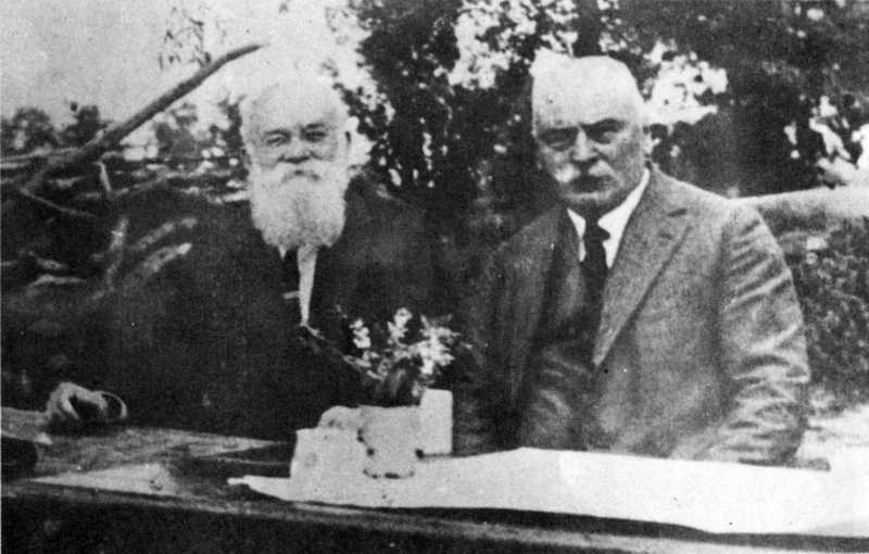 Mykhajlo Hrushevsky (left) and Cyril Studynsky. Fish Reserve in Kononcha, June 9, 1927