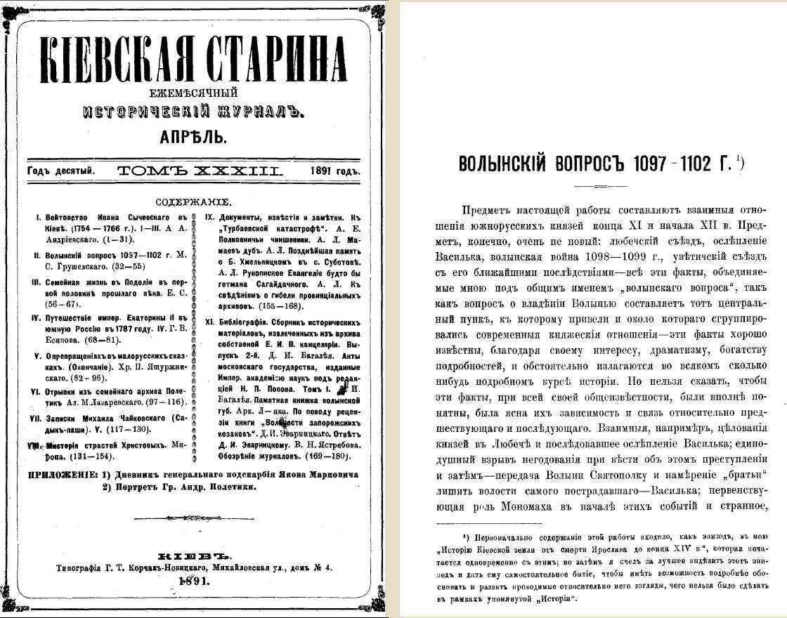 Титульный лист журнала «Киевская старина» (№ 4 за 1891 г.) и первая страница статьи М.С. Грушевского «Волынский вопрос 1097 – 1102 гг.», напечатанной в этом журнале.