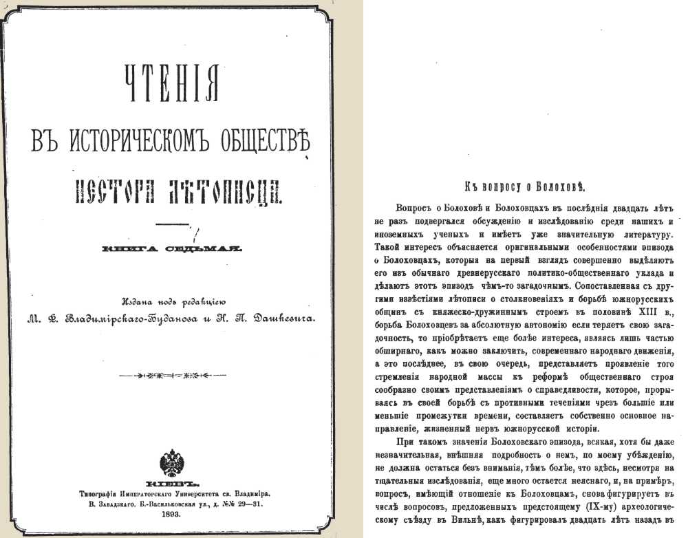 Титульный лист сборника «Чтения в историческом обществе Нестора-летописца» (1893 г., т. 7) и первая страница статьи М.С. Грушевского «К вопросу о Болохове», напечатанной в сборнике.