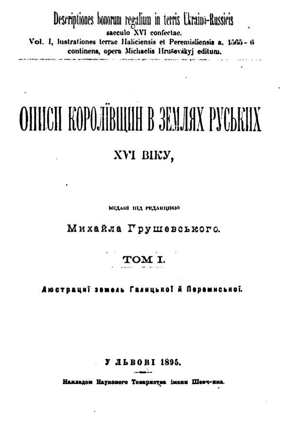 Титульный лист составленного М.С. Грушевским сборника документов «Описания королевщин в украинских землях 16 в. Т. 1. Люстрации земель Галицкой и Перемышльской» (Источники для истории Украины-Руси, 1895 г., т. 1).
