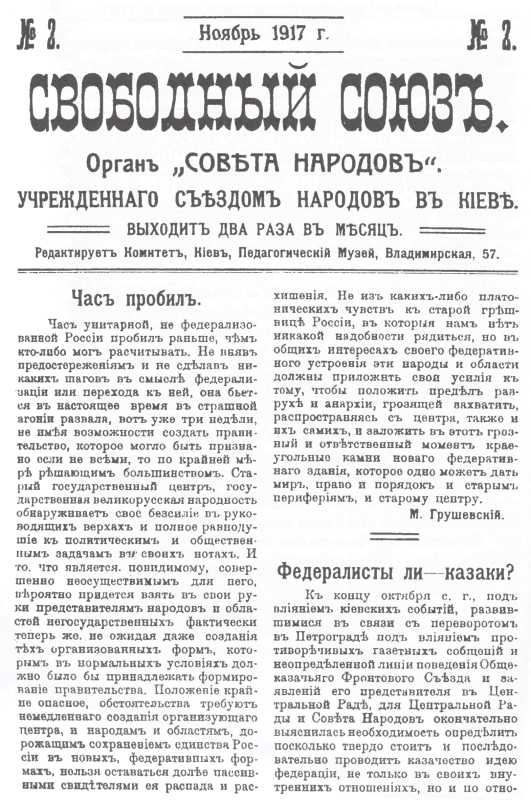 Первая страница журнала «Свободный союз» (1917 г., ноябрь, № 2) с заметкой М. С. Грушевского «Час пробил» По изданию: Грушевский М.С. Сочинения: в 50 т. – Львов: Свит, 2002, т. 4, ч. 1, с. 26. |
