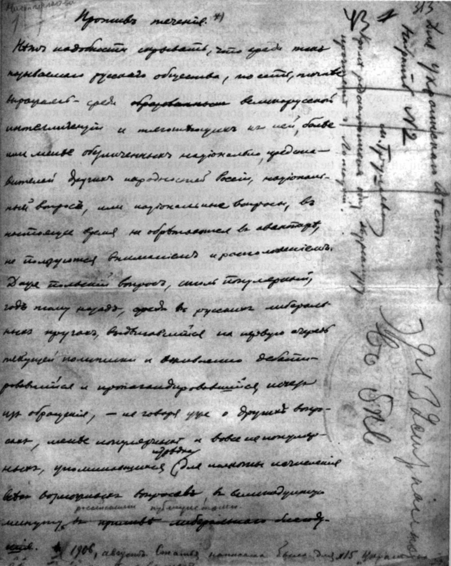 «Против течения» (1905 г.)Первая страница автографа статьи М. С. Грушевского «Против течения» (1905 г.) Печатается по изданию: Грушевский М.С. Сочинения: в 50 т. – Львов: Свит, 2002 г., т. 1, с. 390. |