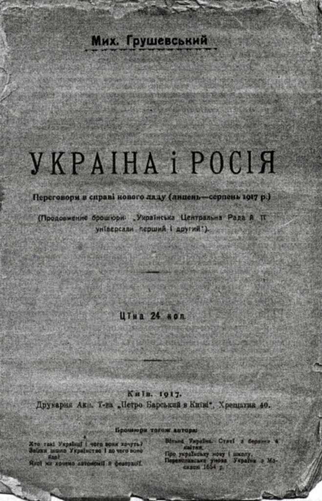 Обложка брошюры М. С. Грушевского «Украина и Россия: переговоры по делу нового строя (июль – август 1917 г.)» (К.: 1917 г.) По изданию: Грушевский М.С. Сочинения: в 50 т. – Львов: Свит, 2002, т. 4, ч. 1, с. 202. |
