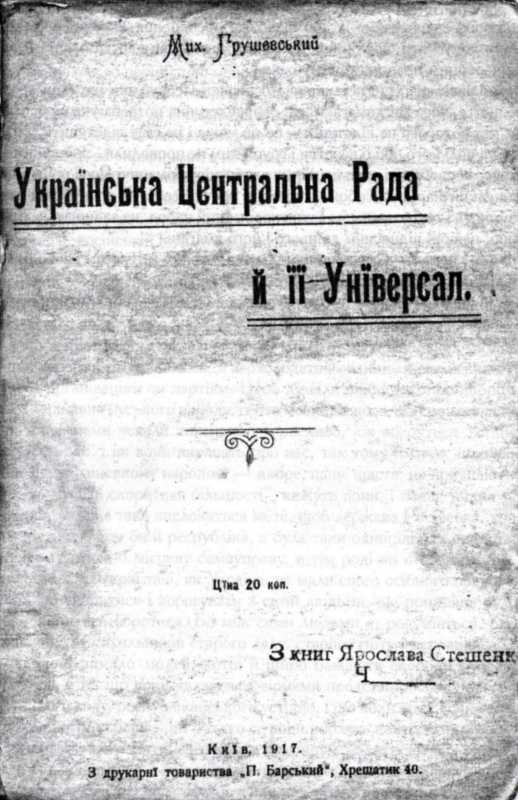 Обложка первого издания брошюры М. С. Грушевского «Украинская центральная рада и ее универсал» (К.: 1917 г.)