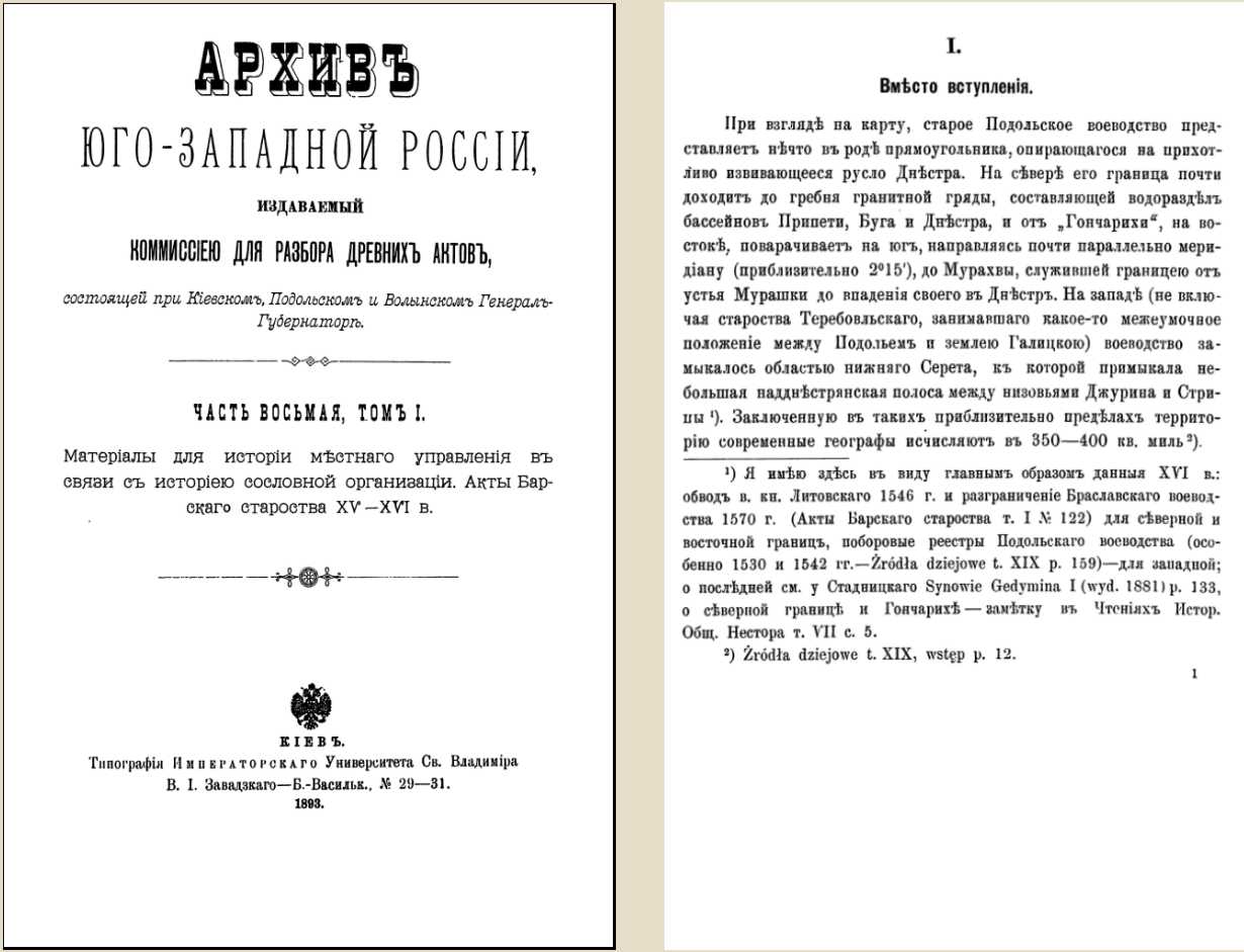«Архів південно-західної Росії» (1893 р.)Титульний аркуш видання «Архів південно-західної Росії» (1893 р., ч. 8, т. 1) і перша сторінка вступної статті М.С. Грушевського до збірки актів Барського староства. |