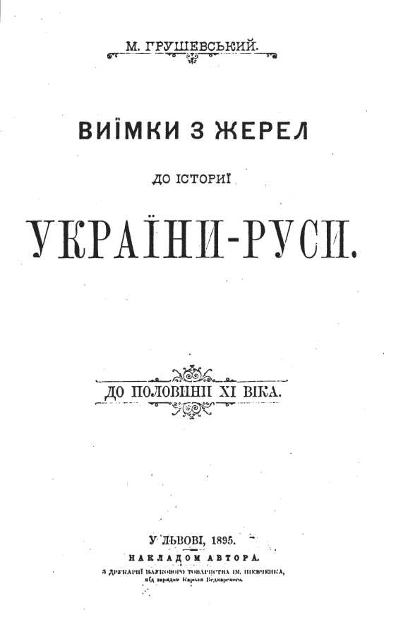 Титульний аркуш складеного М.С. Грушевським збірника «Виїмки з жерел до історії України-Русі» (1895 р.). |