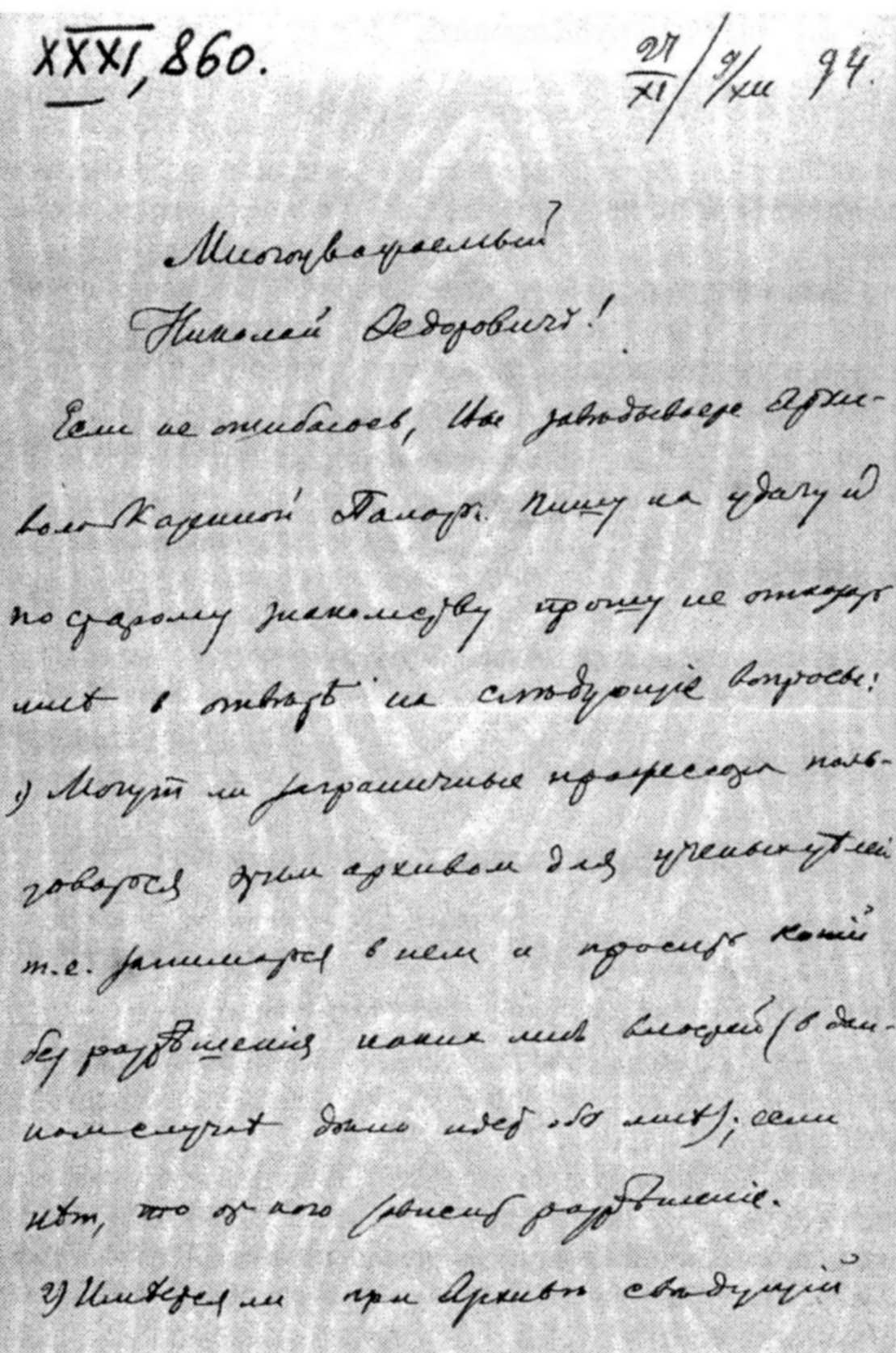 Перша сторінка автографа листа М. С. Грушевського до М.Біляшівського (9 грудня 1894 р.)