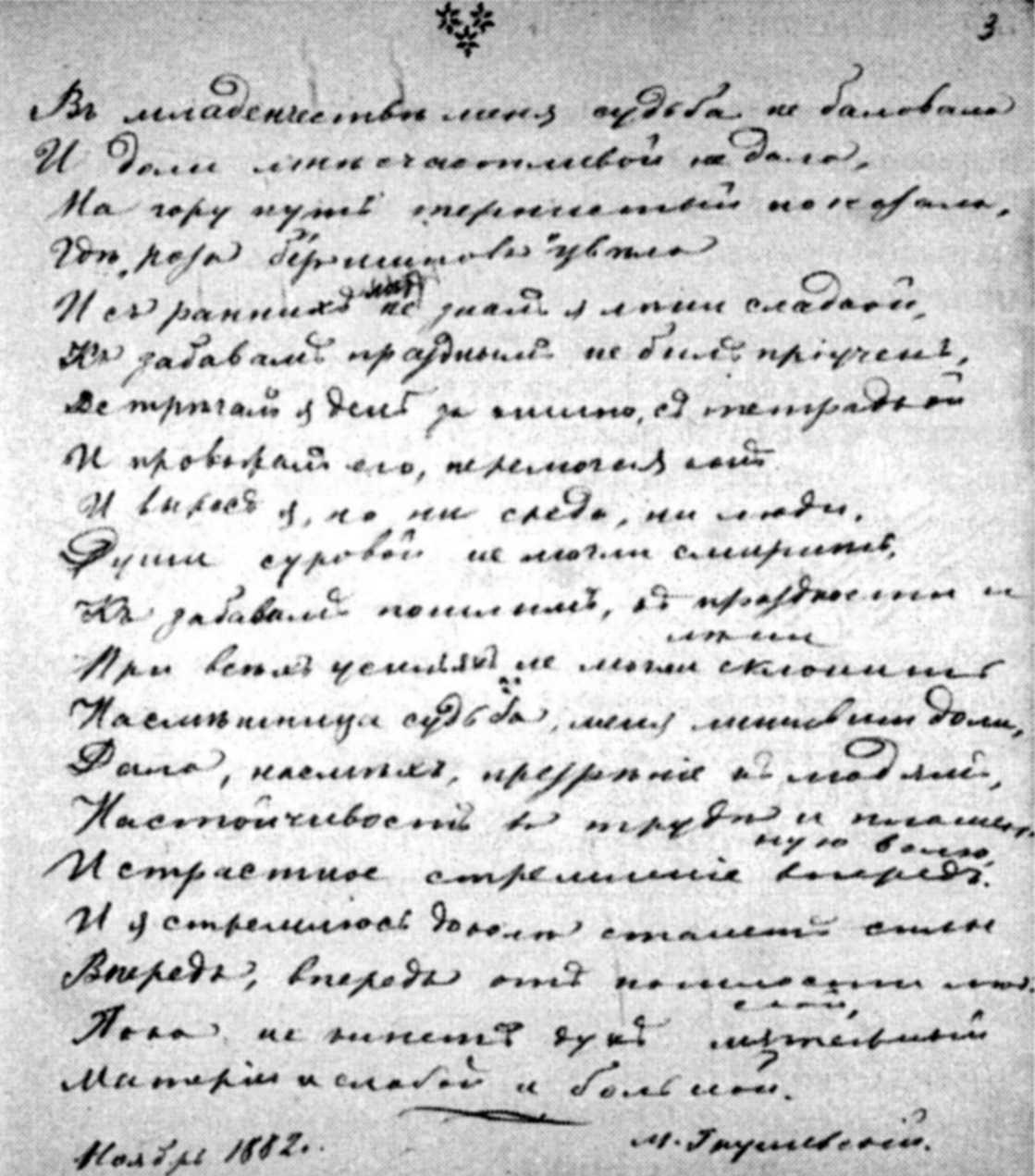 Автограф вірша М. С. Грушевського «В младенчестве меня судьба не баловала» (листопад 1882 р.)