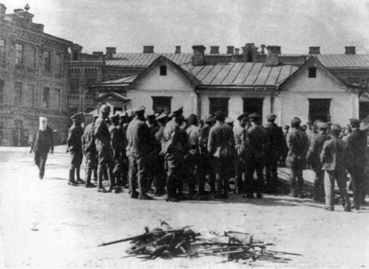 Михайло Грушевський (з лівого краю) на подвір’ї Луцьких казарм у Києві в день гетьманського перевороту і роззброєння січових стрільців. 30 квітня 1918 р.