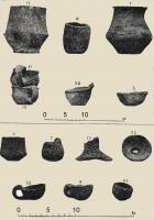 II. Звідти 80 см направо, трохи глибше показавсь скелет; коло голови з правого боку стояла мисочка (№ 5), неакуратно вироблена, з грубими стінами, випалена сильніше від попередніх, але тільки зверху; діаметр 8 см, висока 4 см, і кубок (№ 6), также дуже грубо вироблений, з грубими стінами, і также випалений, кривий, 7 – 9 см високий, діам[етр] горла з стінами 6 см; всередині його був маленький кухлик (№ 7, 4 см високий, 12,5 см наоколо виступу) і маленький круглий корчик з вушком (під кухликом) (№ 8, 3 см високий, діам[етр] горла 4 см); все се дуже грубо і криво руками виліплено, з грубими стінками, без орнаменту і досить сильно обпалено (але наскрізь не пропалено).
