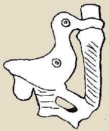 Мала каблучка до висків, типової форми т. зв. букви S (з відігнутим кінцем), з срібла, 1 см діам[етр]; знайдена разом з фібулою (Мек.) – таб. І, 10.
