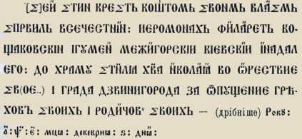 З пізніших пам’яток Звенигорода згадаю одну: се церковний напрестольний хрест, дарований 1705 р. Філаретом Кощаковським, ігуменом межигорським (пізніше – від 1707 р. – мгарським) до своєї родинної церкви. Він зложений з двох тоненьких ажурних, дерев’яних хрестів, розділених новою атласною підшивкою; один хрест обвитий лозою, над хрестом инци, вгорі голуб з підписом: дхъ твои благїи на…, збоку символи страстей, другий має Божу Матір, а з 4-х боків шестокрильців, вгорі звич[айний] монограм Марія. Він оправлений в срібло з сердоліками (карнеолами) і має напись: