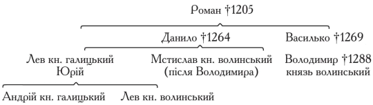 Його спадкоємці не вийшли із меж місцевої, галицько-волинської, політики, зверненої, головним чином, на захід. Притому зі збільшенням династії Галицько-Волинські землі на деякий час поділилися на кілька володінь, і колишня солідарність галицьких і волинських князів послабшала. Однак на початку ХІV ст. галицько-волинські волості зібралися знову в одних руках – у володінні Юрія Львовича. Відомості наші про цю державу, втім, стають дуже бідними з припиненням останнього з українських літописів княжого циклу – Волинського [Династичні відносини можна представити так: