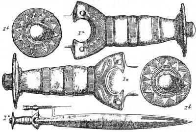 Ручки обох мечів І і II майже тої самої великості й форми, тільки ріжняться дещо фігурою й орнаментом, як то видко з долученого рисунка.