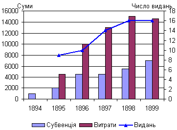 1894 р. дістало Товариство першу субсидію від краєвого сойму 500 з[о]л[отих] р[инських], разом із субсидією 500 з[о]л[отих] р[инських] на «Історичну бібліотеку», перейнятою Товариством разом з сим видавництвом – 1 000.